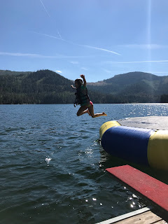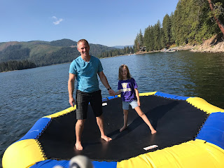 We paddle boarded, read in the sunshine, watched football, ate, hiked, took boat rides, jumped on the water trampoline, played games, and enjoyed family time all weekend long. Uncle Jimmy and Aunt Sara joined us for dinner Sunday evening, and the ribs and peach pie were amazing.