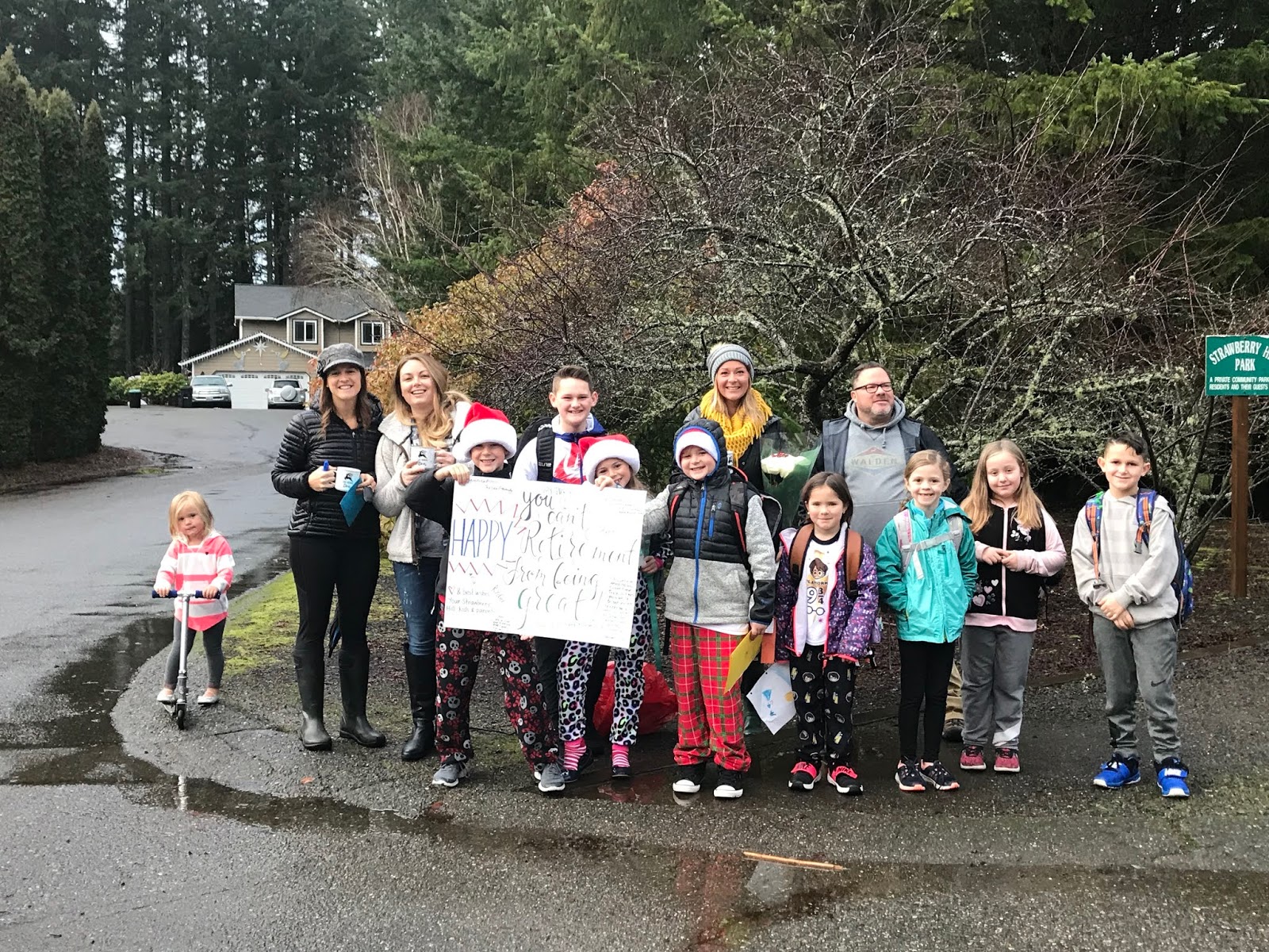 The woman who has driven the school bus for our neighborhood retired today. She has been driving our neighborhood route for about a decade! So we gathered kids from all three bus stops into one place and presented her with a sign, flowers, a card, a gift certificate to a local restaurant, and hugs with smiles! The kids had so much fun being a part of this surprise and she loved it!
