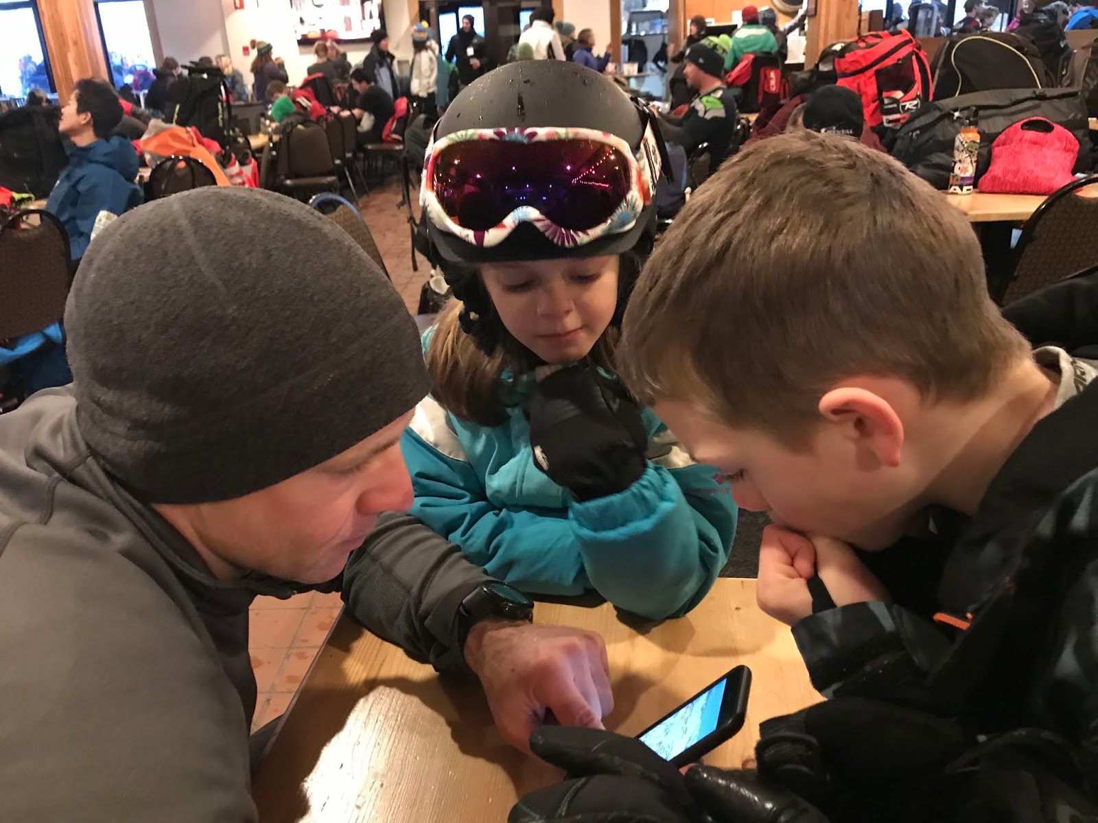 Saturday ski break in the lodge – planning their next hill in the Crystal app.