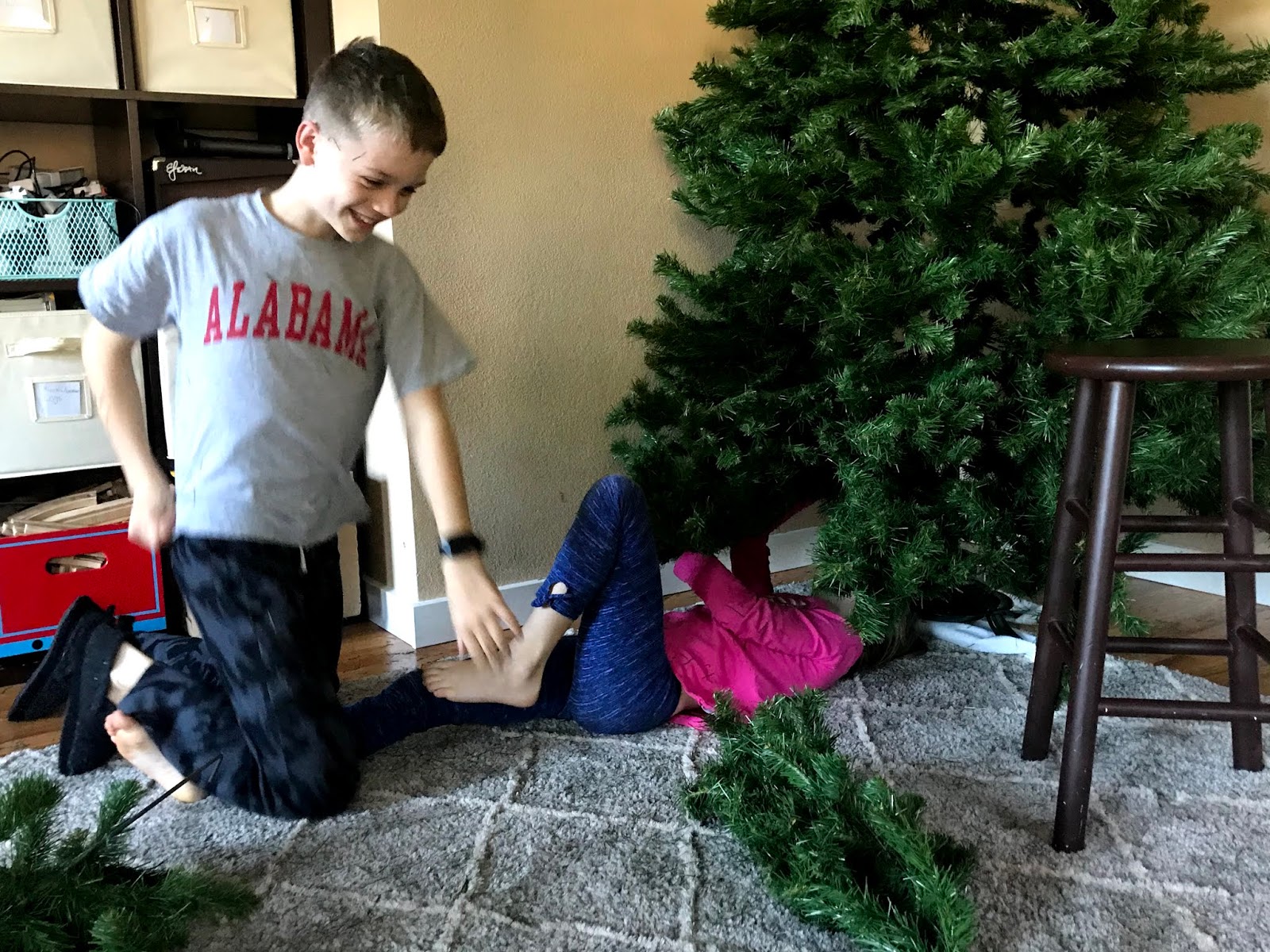 Our family left after the holidays and JT wanted to get moving on the Christmas tree, so he offered to set it up. We had two hours before we needed to leave for basketball, and he was a man on a mission.