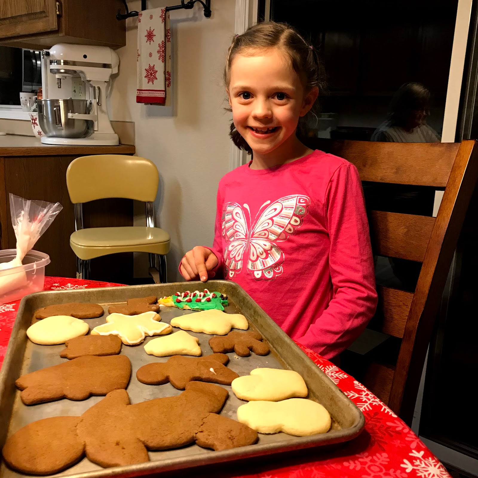 For the last several years, we’ve been invited to Grandma Cole’s house to decorate Christmas cookies as part of our December activity list. The kids look forward to this very much – and so do the adults. 🙂 This year, Grandma prepped by baking the cookies ahead of time so we could walk in and start decorating. We had a great time chatting and decorating and eventually eating our cookies – and now we have a giant platter full in our kitchen, tempting us daily!