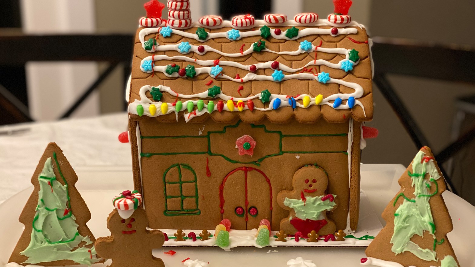 I bought some gingerbread houses for a work virtual event, and the kids wanted some too. Sometimes we decorate them, sometimes we make them, sometimes we don’t do it at all. This year we grabbed the Costco kits and a weekend evening to complete them – and they turned out like magazine ads, I think!