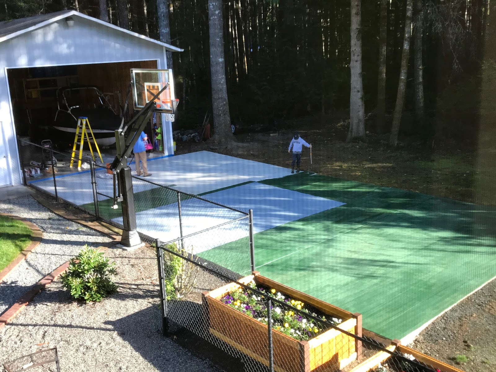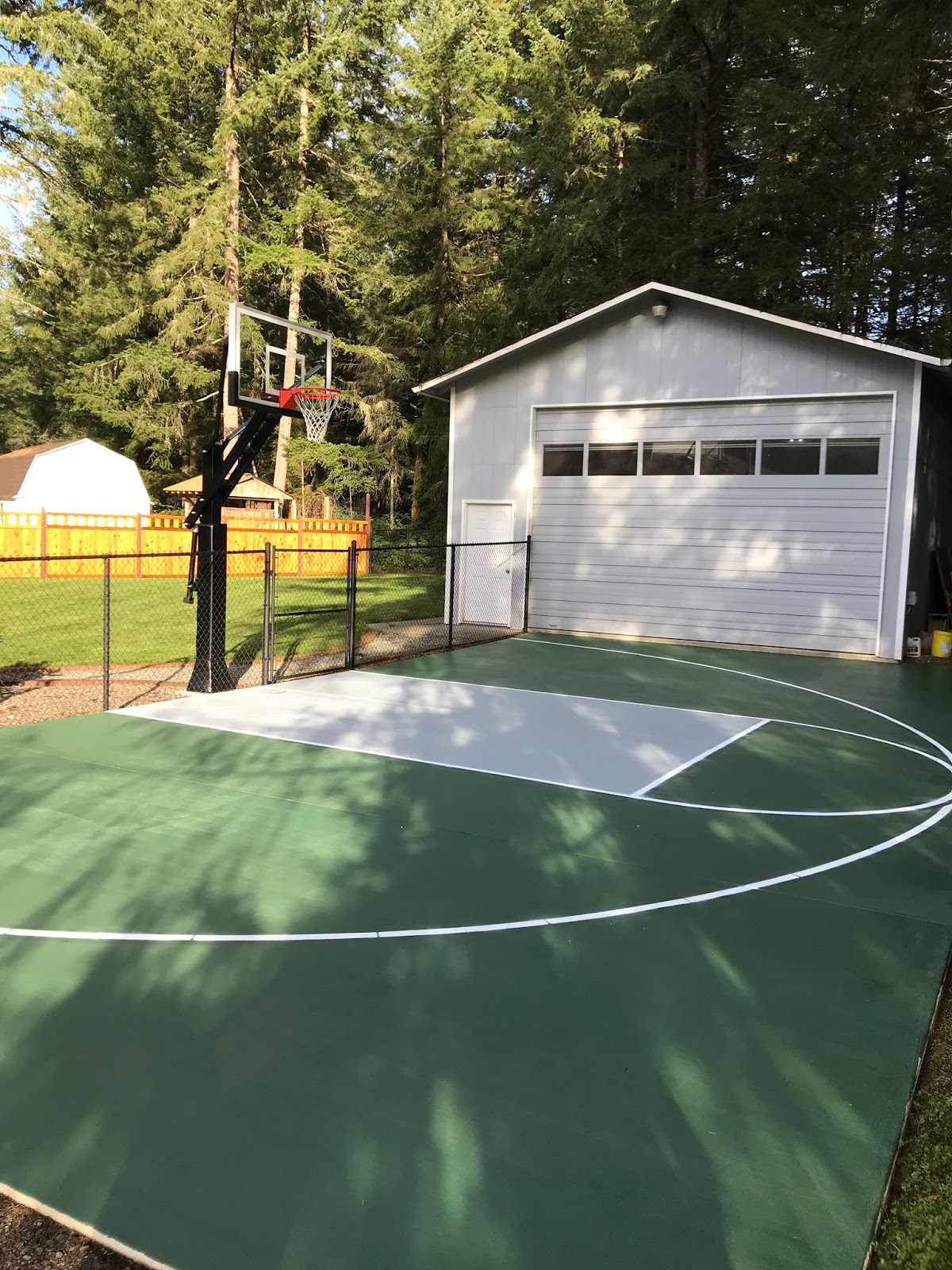 I love how it blends with our green lawn and trees, and grey shop. It looks so much nicer and really compliments the whole backyard without being a focal point. AND when we play pig we’ll have a set of lines to work from. 🙂