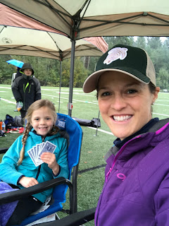 The next weekend, it poured. Fortunately the screen tent that we bought for summer repurposes as a rain shelter. I am thrilled that it worked. It was so nice to have a dry spot to hang out and watch the game without being miserable. We might have to use it for baseball season too. Ha!
