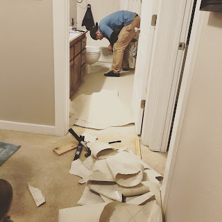 Jim has been hard at work the last two weekends replacing the bathroom floor in our upstairs hall bathroom. Like any project, there were more steps than we’d planned but I am so happy with the results! He laid new floor, removed the random towel rack, and installed a new toilet. Next up: the laundry room overhaul…