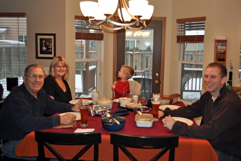 It was a small group for Thanksgiving this year, but that was just as well… everyone has been sick! I got a cold three weeks ago and it snuck back on me, and JT and Haley have been stuffy and coughy. Then Jim came down with something horrible and my mom got bronchitis and a sinus infection. We made the most of our day anyway, and my dad did a great job taking over for my mom as kitchen assistant and baby holder. It was also our first Thanksgiving in a long time (ever?) with six inches of snow on the ground.